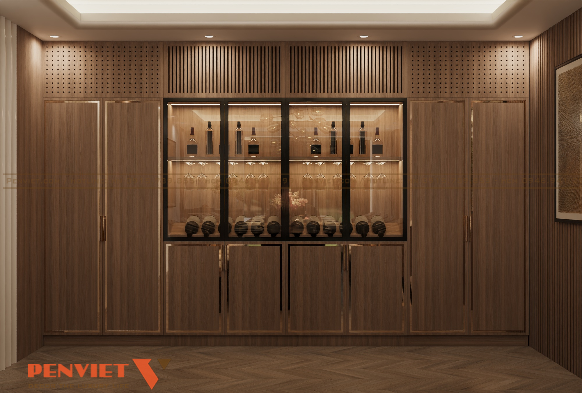 Toàn bộ không gian sử dụng vật liệu gỗ làm chủ đạo, từ hệ tủ, vách ốp cho đến trần và sàn. Gỗ mang lại cảm giác ấm áp, sang trọng và tạo sự liên kết xuyên suốt trong thiết kế. Với những chủ đầu tư đang cân nhắc cải tạo, đây là giải pháp vật liệu an toàn và có giá trị sử dụng lâu dài.