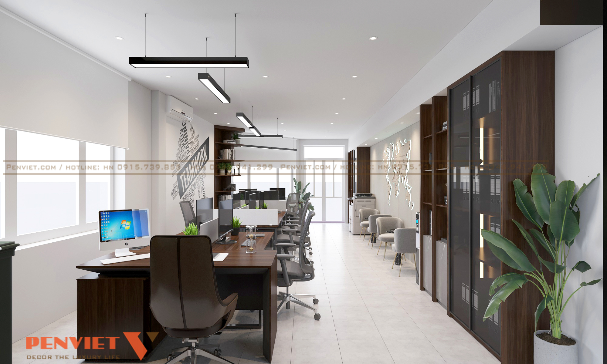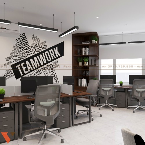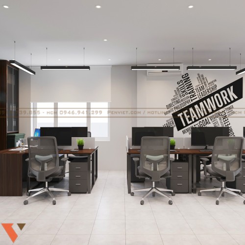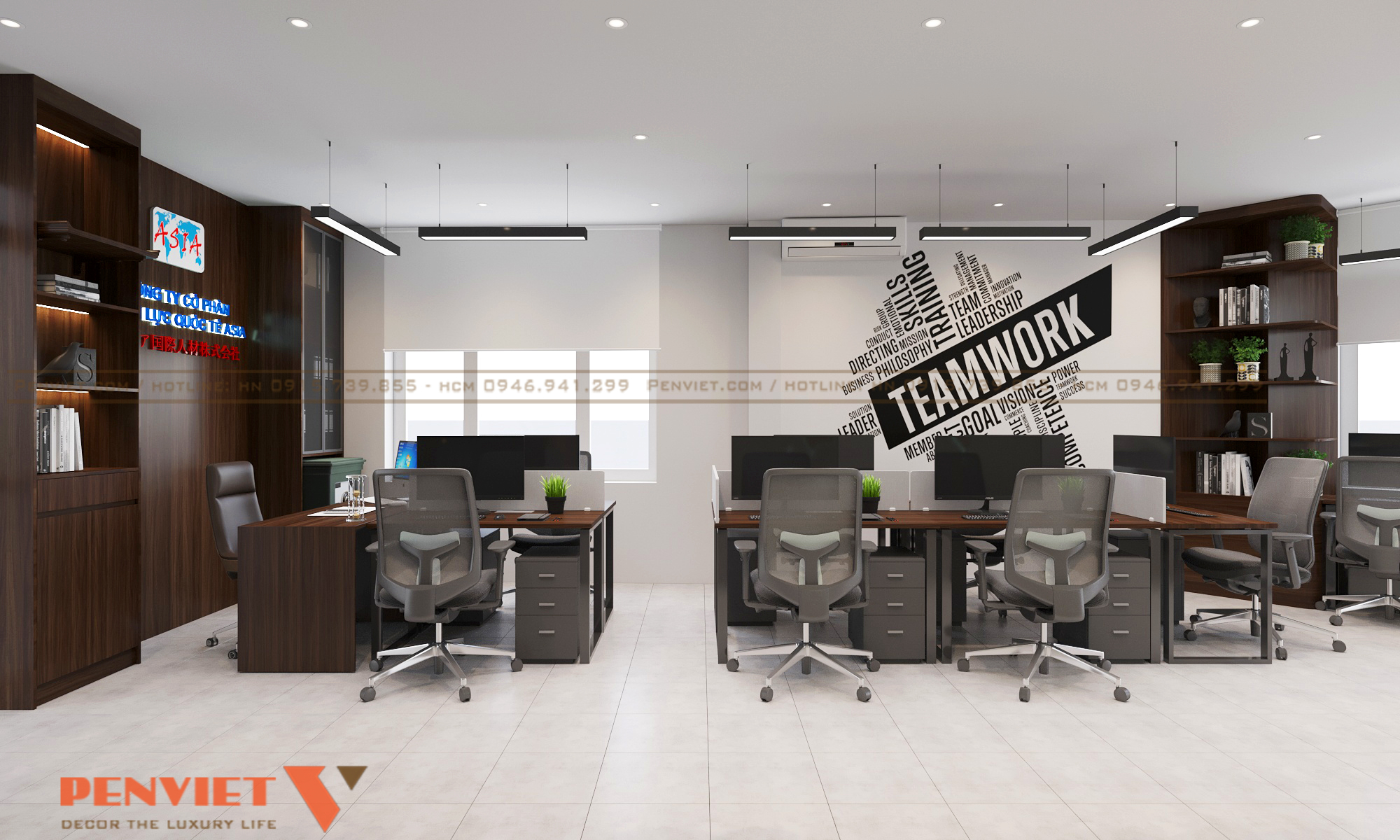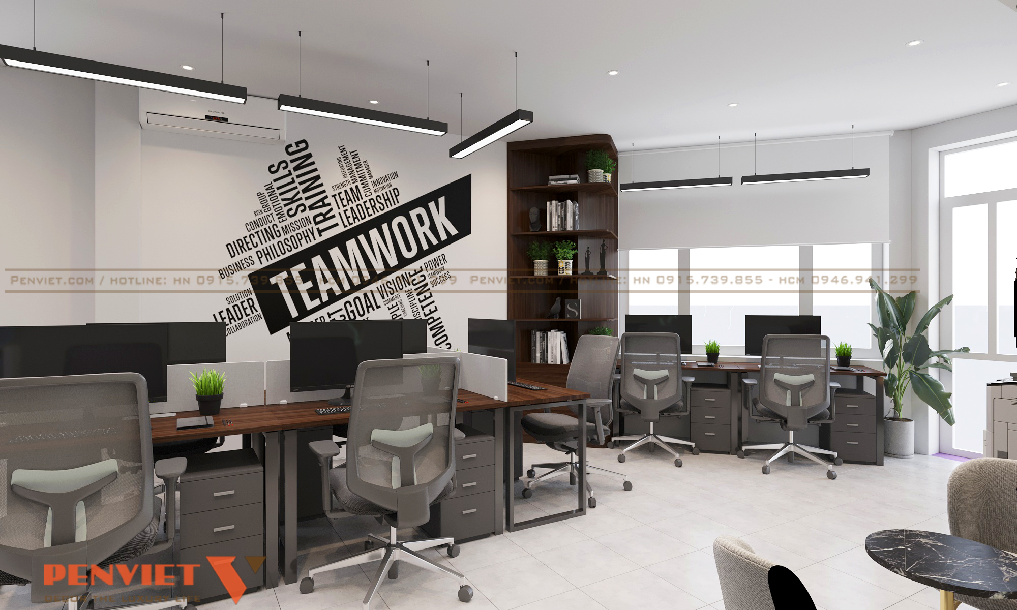 Không gian thoáng, ánh sáng hợp lý và nội thất tiện nghi giúp nhân viên tập trung và thoải mái. Văn phòng gọn gàng, thẩm mỹ cao để lại ấn tượng tích cực với khách hàng và đối tác. Sự sắp xếp cụm bàn làm việc và những thông điệp truyền cảm hứng trên tường giúp tăng tính đoàn kết trong đội ngũ.