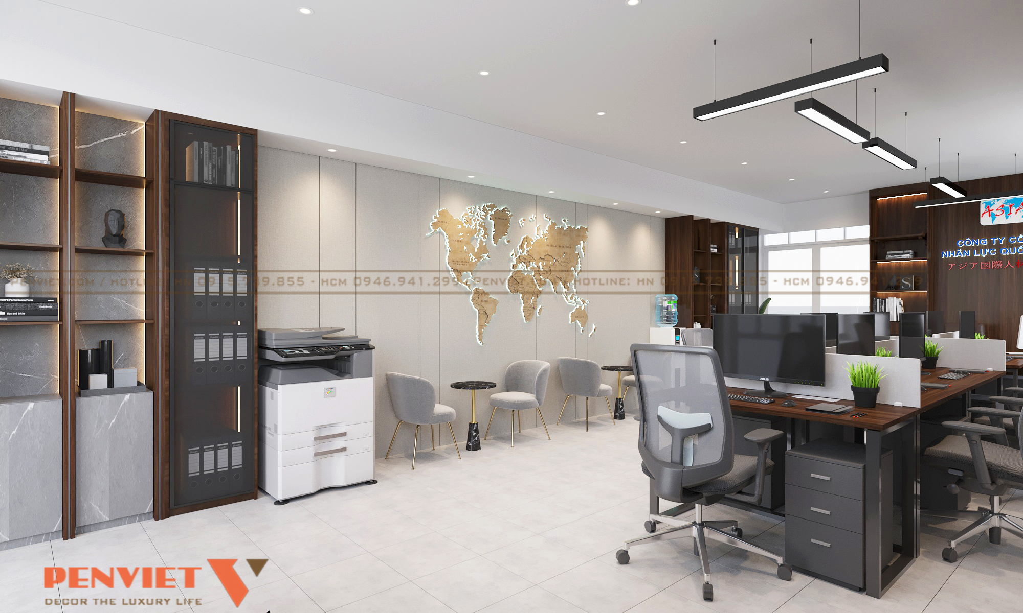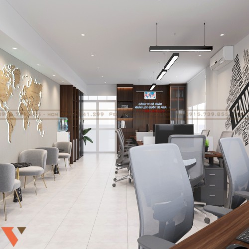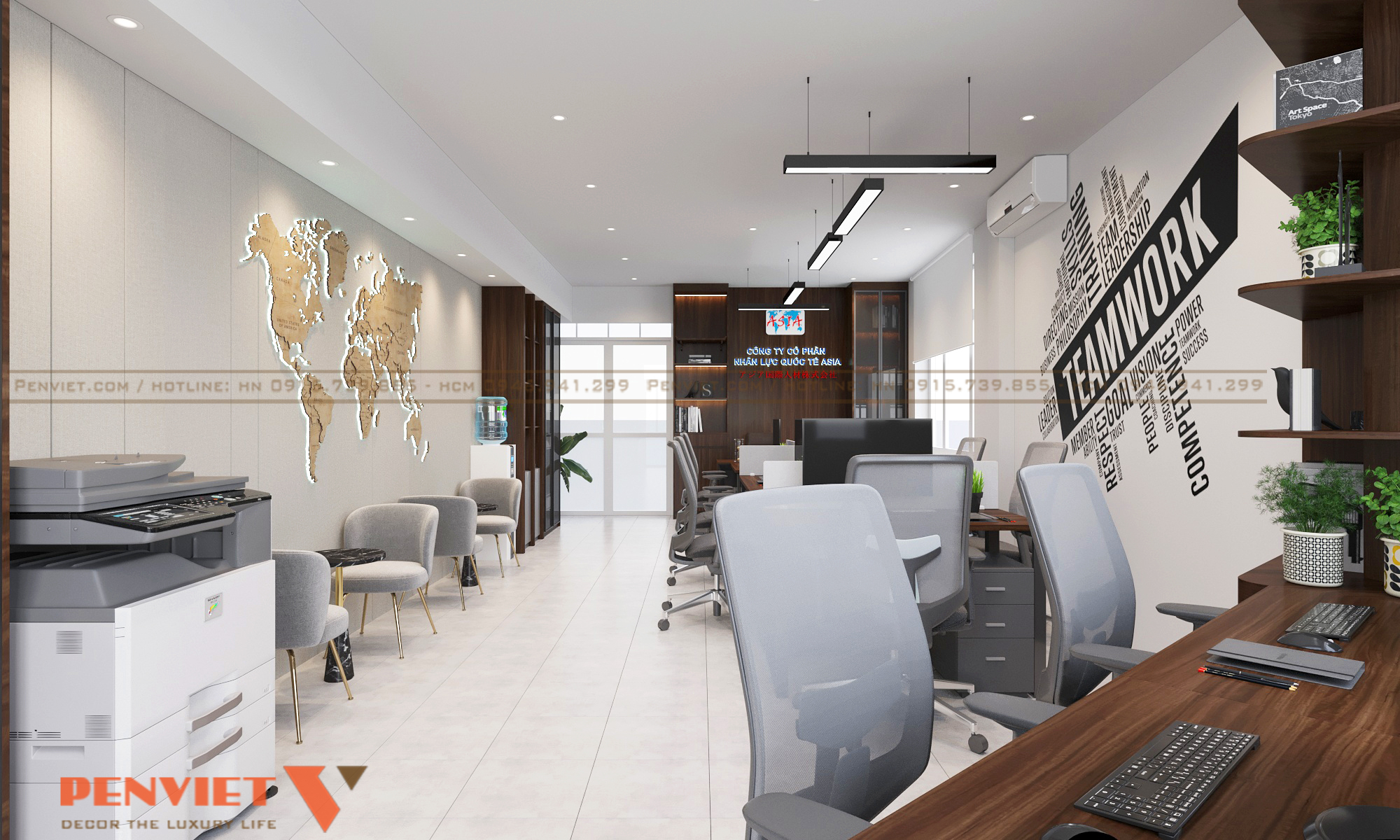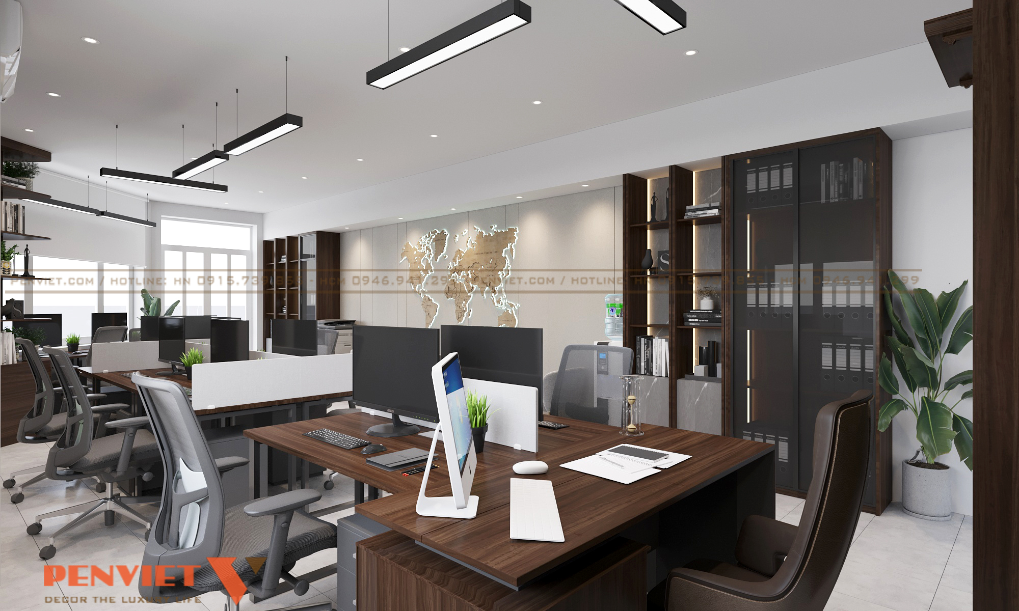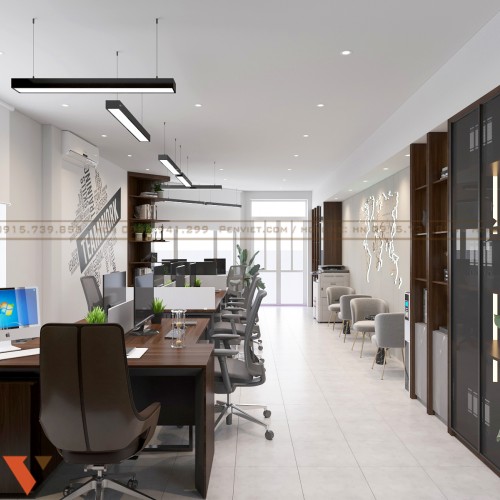Không gian thoáng, ánh sáng hợp lý và nội thất tiện nghi giúp nhân viên tập trung và thoải mái. Văn phòng gọn gàng, thẩm mỹ cao để lại ấn tượng tích cực với khách hàng và đối tác. Sự sắp xếp cụm bàn làm việc và những thông điệp truyền cảm hứng trên tường giúp tăng tính đoàn kết trong đội ngũ.