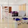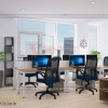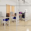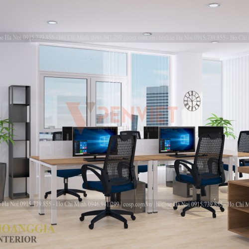 Các vách ngăn được thiết kế làm từ kính trong suốt để giảm diện tích thay vì dùng tường bê tông. Không gian làm việc trở nên rộng rãi và thoáng đãng hơn. Bàn làm việc dành cho nhân viên hiện đại và tối giản chi tiết. Mặt bàn được trang bị máy tính các thiết bị cần thiết cho nhân viên.
