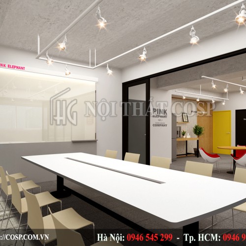 Phòng họp được thiết kế đơn giản, gọn gàng với một chiếc bàn dài lịch sự cùng 2 hàng ghế ngồi với màu kem dịu nhẹ. Kết hợp với đó là hệ đèn rọi, đèn downlight ánh sáng trắng khiến không gian tràn đầy năng lượng và nâng cao tinh thần cho nhân viên.