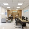 Toàn bộ văn phòng được thiết kế theo bố cục mở, giúp tận dụng tối đa nguồn sáng tự nhiên từ hệ thống cửa kính lớn bên trái. Trần nhà lắp đặt các tấm panel vuông đồng đều, kết hợp đèn âm trần LED ánh sáng trắng, tạo hiệu ứng chiếu sáng đều khắp, giúp không gian luôn sáng rõ, tiết kiệm điện năng mà vẫn mang lại cảm giác dễ chịu.