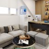 Ngay gần cửa ra vào là khu vực tiếp khách được bố trí hợp lý với một bộ ghế sofa bọc nỉ màu xám nhạt kết hợp bàn trà đôi dáng tròn. Bàn được thiết kế với khung kim loại đen và mặt kính trong suốt, tạo cảm giác nhẹ nhàng, hiện đại. Thảm trải sàn cùng tông màu trung tính giúp phân vùng khu vực tiếp khách rõ ràng với phần còn lại của văn phòng mà không cần dùng đến vách ngăn.