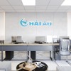 Một trong những điểm đặc biệt ấn tượng của văn phòng là mảng tường bên phải ốp đá hoặc gạch vân xi măng sáng màu, tạo nên cảm giác vững chãi và hiện đại. Logo “HẢI ÂU” được gắn nổi, kết hợp đèn LED viền sáng hắt sau tạo hiệu ứng ánh sáng lung linh, vừa hiện đại vừa chuyên nghiệp. Ánh sáng nhẹ nhàng làm nổi bật logo thương hiệu phù hợp với phong cách văn phòng hiện đại yêu cầu cả thẩm mỹ lẫn hiệu quả sử dụng.