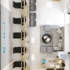 Mỗi chỗ ngồi được trang bị vách ngăn mica trong suốt để đảm bảo tính riêng tư mà không cản trở tầm nhìn hay giao tiếp giữa các thành viên. Ghế xoay bọc da đen, tay vịn kim loại tạo nên sự chuyên nghiệp, đồng bộ. Bố trí ghế xoay có bánh xe thuận tiện cho việc di chuyển trong không gian làm việc chung.