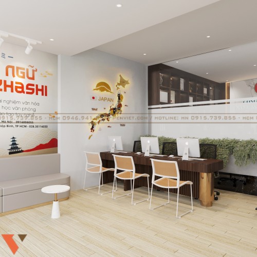- Thiết kế nổi bật: Tường trang trí bằng poster lớn, thể hiện thông tin về doanh nghiệp.