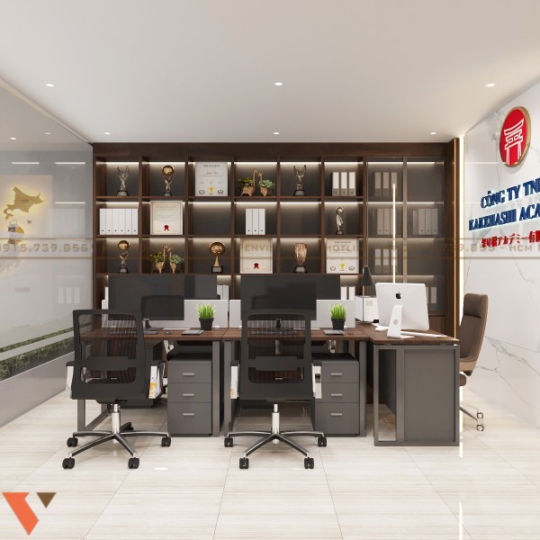 - Kho lưu trữ: Tủ kệ âm tường với nhiều ngăn chứa hồ sơ, kết hợp trưng bày giải thưởng, giấy chứng nhận.