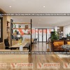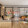 Văn phòng được chia thành 2 khu vực và được ngăn cách bởi một lớp kính chắn khung gỗ tự nhiên tạo được sự đồng nhất giữa các thiết bị với nhau. Sát tường sẽ là những tủ trưng bày sách và chứa những tài liệu của công ty.