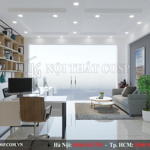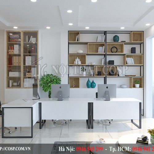 Bức tường phía sau bàn làm việc sử dụng hệ kệ tủ sách cỡ lớn nhằm phục vụ nhu cầu để tài liệu. Đặt kệ tài liệu sau bàn làm việc vừa giúp tận dụng không gian vừa giúp thuận tiện cho nhân viên tìm kiếm tài liệu.