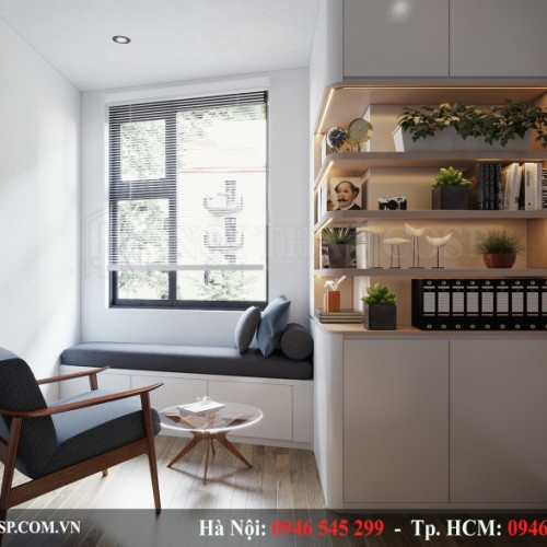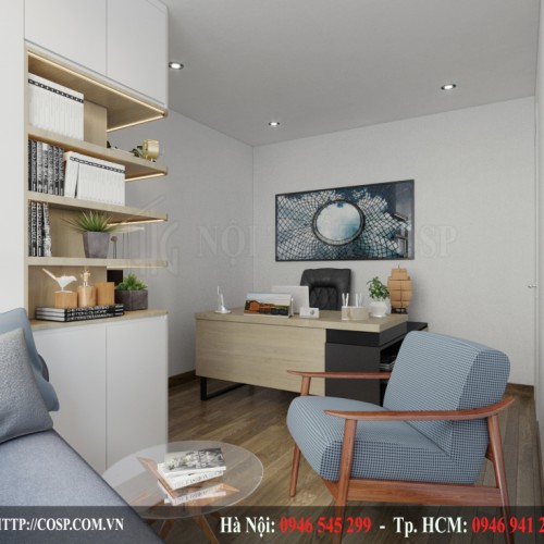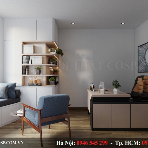 Đơn vị thiết kế Cosp sẽ phân thành 2 khu vực là chỗ làm việc và khu vực đọc sách của giám đốc.