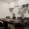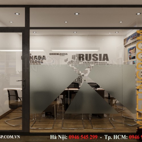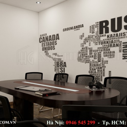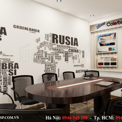 Mặt sàn được ghép gạch gỗ, mặt tường trắng bên trong phòng họp được trang trí hình bản đồ thế giới với lần lượt tên các nước trên thế giới, font chữ màu đen trên nền tường trắng. Tất cả tạo nên sự mới lạ và trẻ trung cho phòng họp.