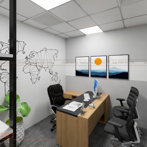 Còn phía bên trái là 3 phòng riêng cho các sếp. 3 phòng có diện tích bằng nhau nhưng mỗi phòng là một thiết kế thú vị các bạn có thấy ngay khi bước chân vào phòng. Mỗi phòng sếp đều có một bàn làm việc bằng gỗ MDF chống ẩm phủ melamine, có tủ thấp để đồ và 1 ghế ngồi, 1 ghế tiếp khách.