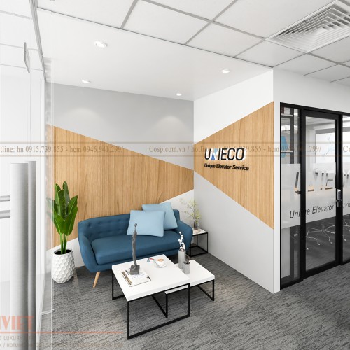Tại đây, chúng tôi sử dụng gỗ tự nhiên, đệm bọc nỉ để có chiếc ghế sofa gỗ bọc nỉ xanh dương đẹp, có gối ôm, có bàn trà bằng khung sắt sơn tĩnh điện, mặt gỗ MDF chống ấm phủ melamine. Vách logo là Gỗ MDF chống ẩm phủ melamine với Bộ logo: "UNIECO" mặt mica chân fomex, Bộ chữ: "Unique…." mica dẹt 4mm