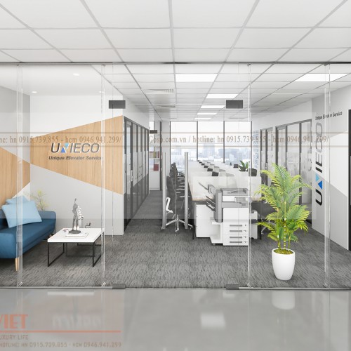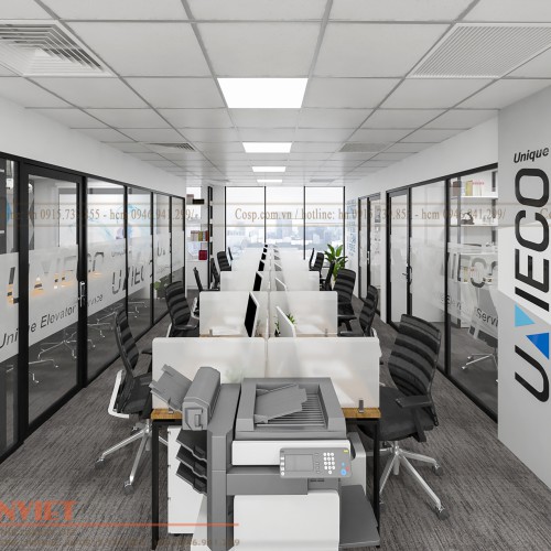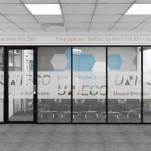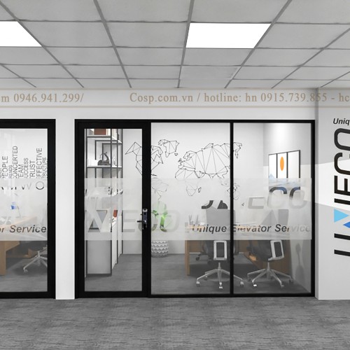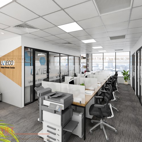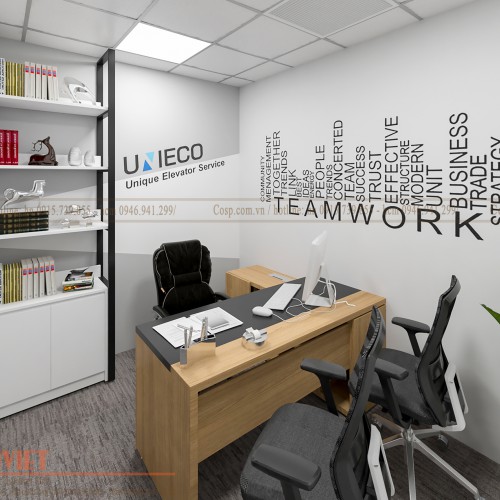 Bộ chữ: "UNIECO Unique …" mica dẹt 4mm; Gỗ MDF chống ẩm phun sơn ; bàn họp chân sắt sơn tĩnh điện, mặt bàn gỗ MDF chống ẩm phủ melamine và ghế chân quỳ. Đây là mẫu ghế chúng tôi thường dùng trong các mẫu thiet ke van phong.