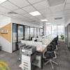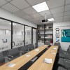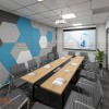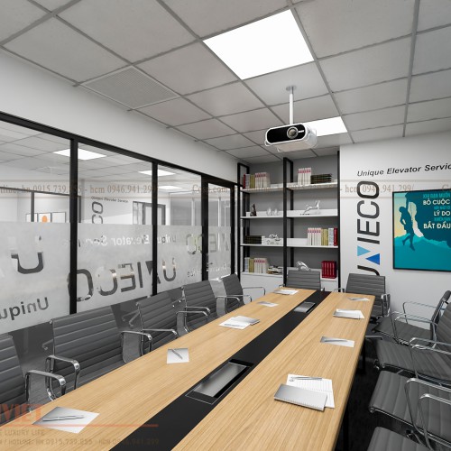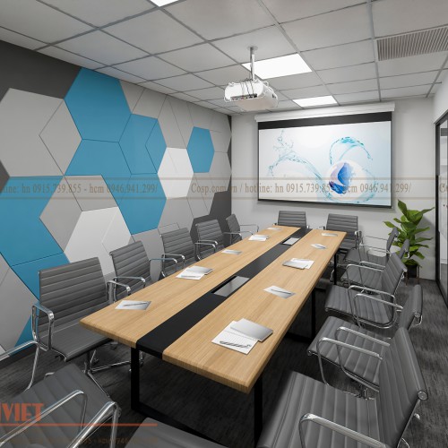 Phòng họp nằm phía bên phải với một phong cách hiện đại. Ánh sáng phù hợp bàn ghế thoải mais và có khả năng cách âm tốt. Ở vách tường phía trước, bộ chữ decor bằng mica dẹt 4mm, giấy dán decal và tranh lụa khung gỗ treo tường. Bên cạnh là một kệ trưng bày sát tường bằng khung sắt sơn tĩnh điện, gỗ MDF chống ẩm phủ melamine.