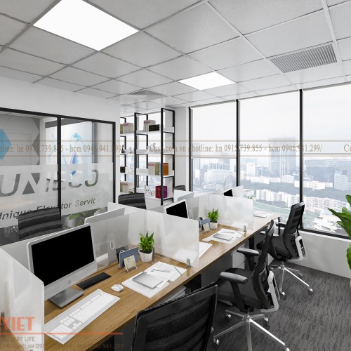 Phòng làm việc có vị trí ở giữa các phòng của sếp và phòng họp. Phòng có diện tích lớn nhất bởi nơi đây chúng tôi thiết kế sao cho 20 nhân viên có thể ngồi và làm việc một cách thoải mái.