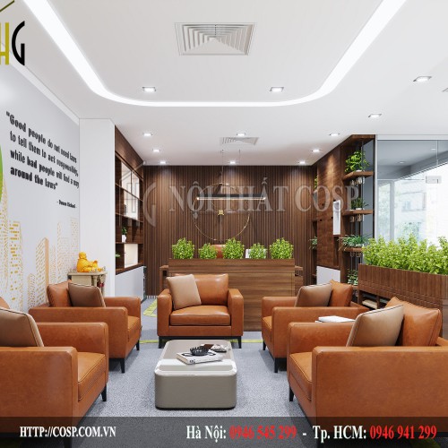 Phòng làm việc của nhân viên được chia làm hai khu vực chính. Ở bên trái chúng tôi đặt một bộ ghế sofa gỗ dáng chữ L cùng 1 chiếc bàn trà tiếp khách. Chiếc sofa được bọc da màu nâu sang trọng có tay vịn bằng gỗ melamine cao cấp.