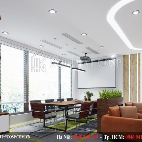 Tiếp đến là khu vực phòng họp với mặt sàn được trải thảm màu xám mang nét nghiêm nghị và hài hòa. Bộ bàn ghế dùng để họp được đặt gần cửa sổ để đón được ánh sáng tự nhiên, giúp tinh thần mọi người được cởi mở hơn.