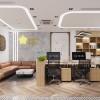 Phía chính giữa phòng là một bộ bàn ghế sofa riêng biệt với chất liệu cao cấp và màu sắc đậm nét. Qua đó, mẫu thiết kế văn phòng Star Wood - Gia Lâm cho ta thấy được sự tỉ mỉ và tinh tế trong từng chi tiết nội thất nhỏ nhất.