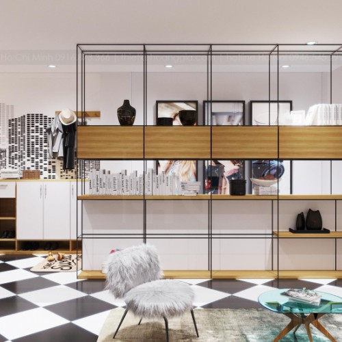 Hệ thống bàn làm việc, kệ trưng bày đều được làm bằng gỗ MDF khung sắt đảm bảo sự vững chắc trong quá trình sử dụng. Gỗ MDF có ưu điểm không bị cong vênh, biến dạng, co ngót, giá thành phù hợp mà có tính thẩm mỹ cao nên trong thiết kế nội thất được sử dụng rất nhiều.
