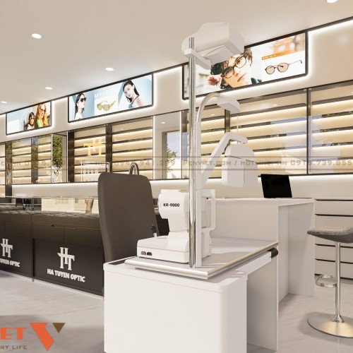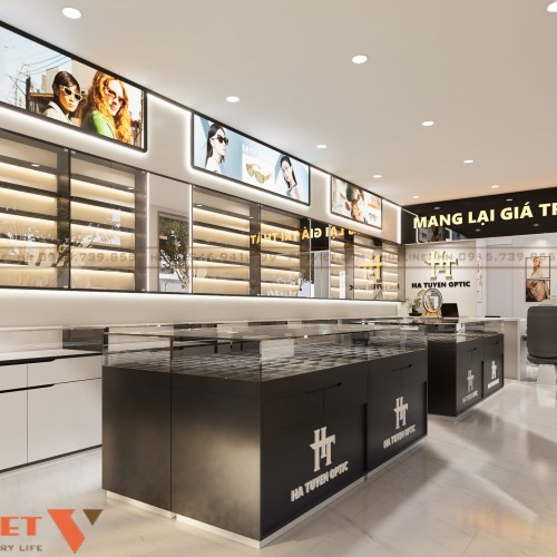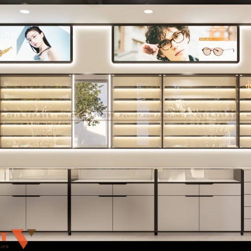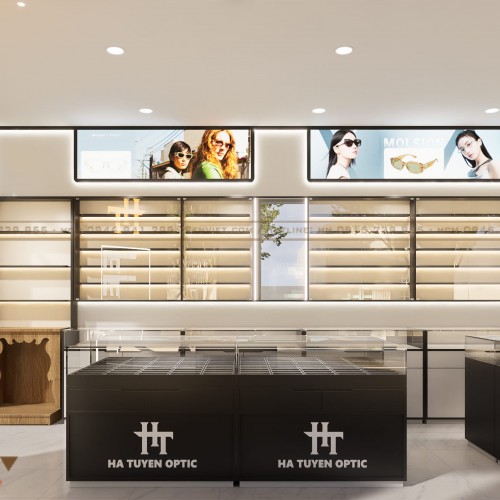 Không gian gọn gàng nhưng trưng bày được nhiều mẫu kính. Luồng di chuyển thuận tiện, giảm ùn tắc khi đông khách. Ánh sáng được xử lý tốt, hỗ trợ khách thử kính chính xác. Thiết kế phù hợp để chủ đầu tư cải tạo nhanh, chi phí hợp lý và dễ vận hành lâu dài.