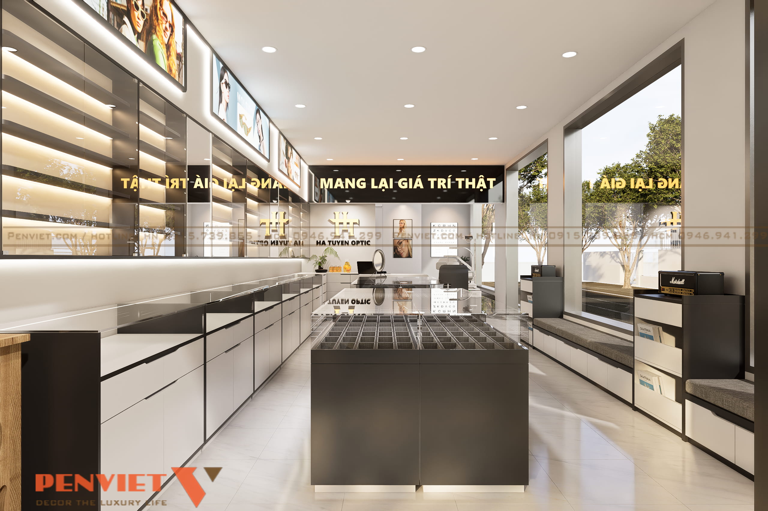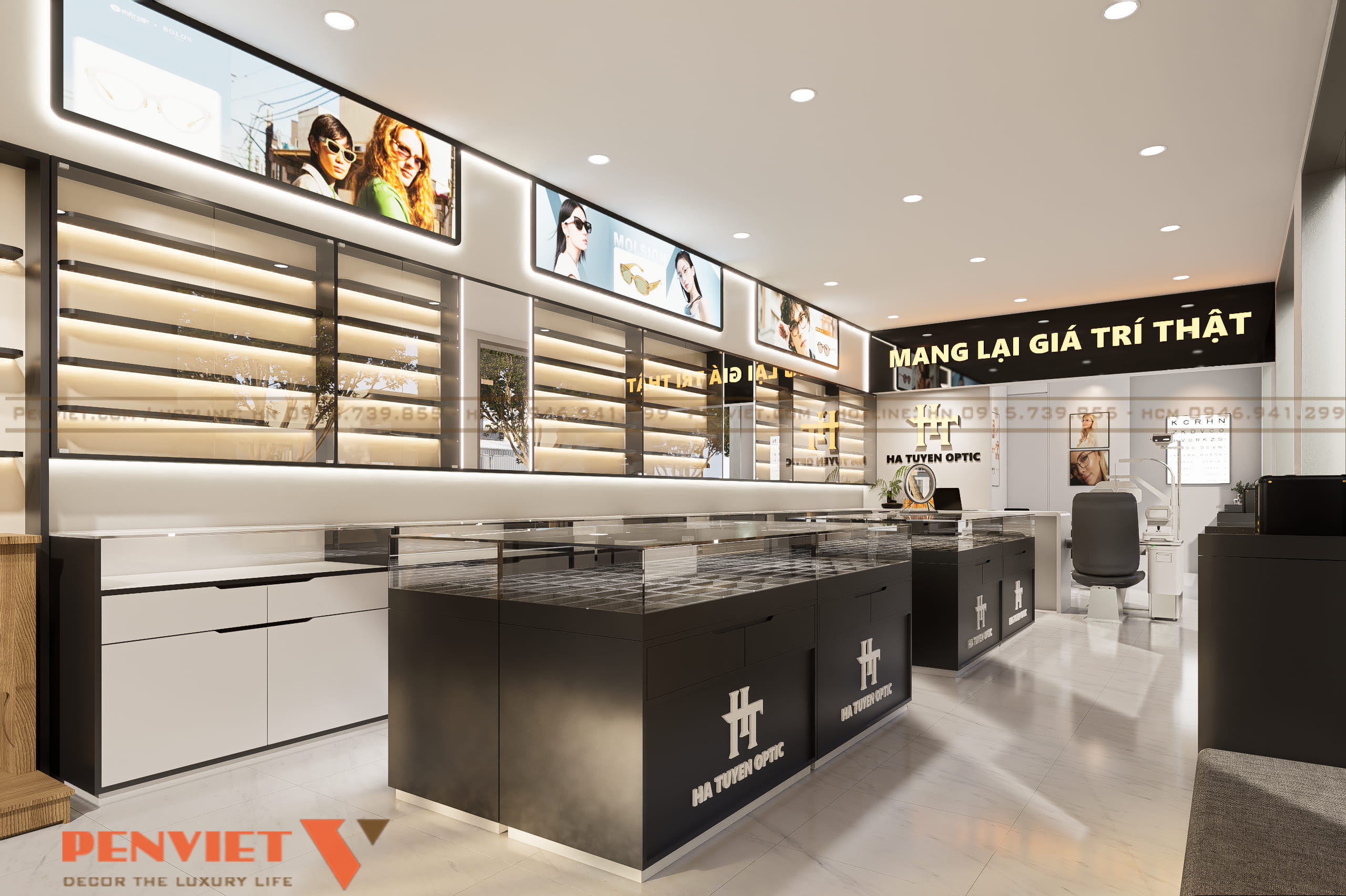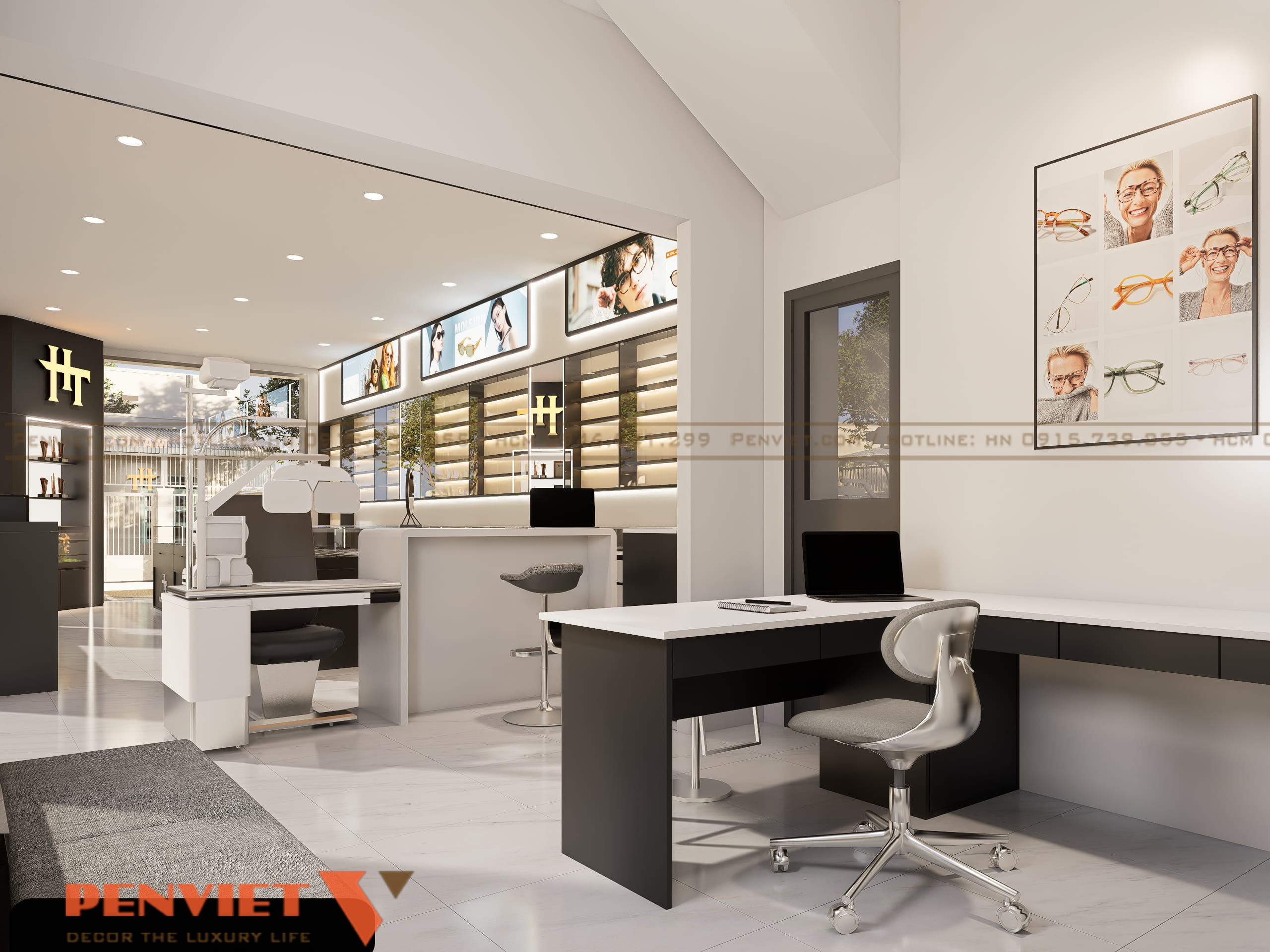 Khu trưng bày gắn tường sử dụng hệ tủ kính kết hợp đèn led, làm nổi bật sản phẩm. Quầy tư vấn và đo mắt bố trí cuối nhà, đảm bảo riêng tư và tập trung. Khu chờ được đặt cạnh cửa sổ, tận dụng ánh sáng tự nhiên và tạo cảm giác thoải mái. Mỗi khu vực đều rõ vai trò, hỗ trợ quy trình bán hàng mạch lạc.