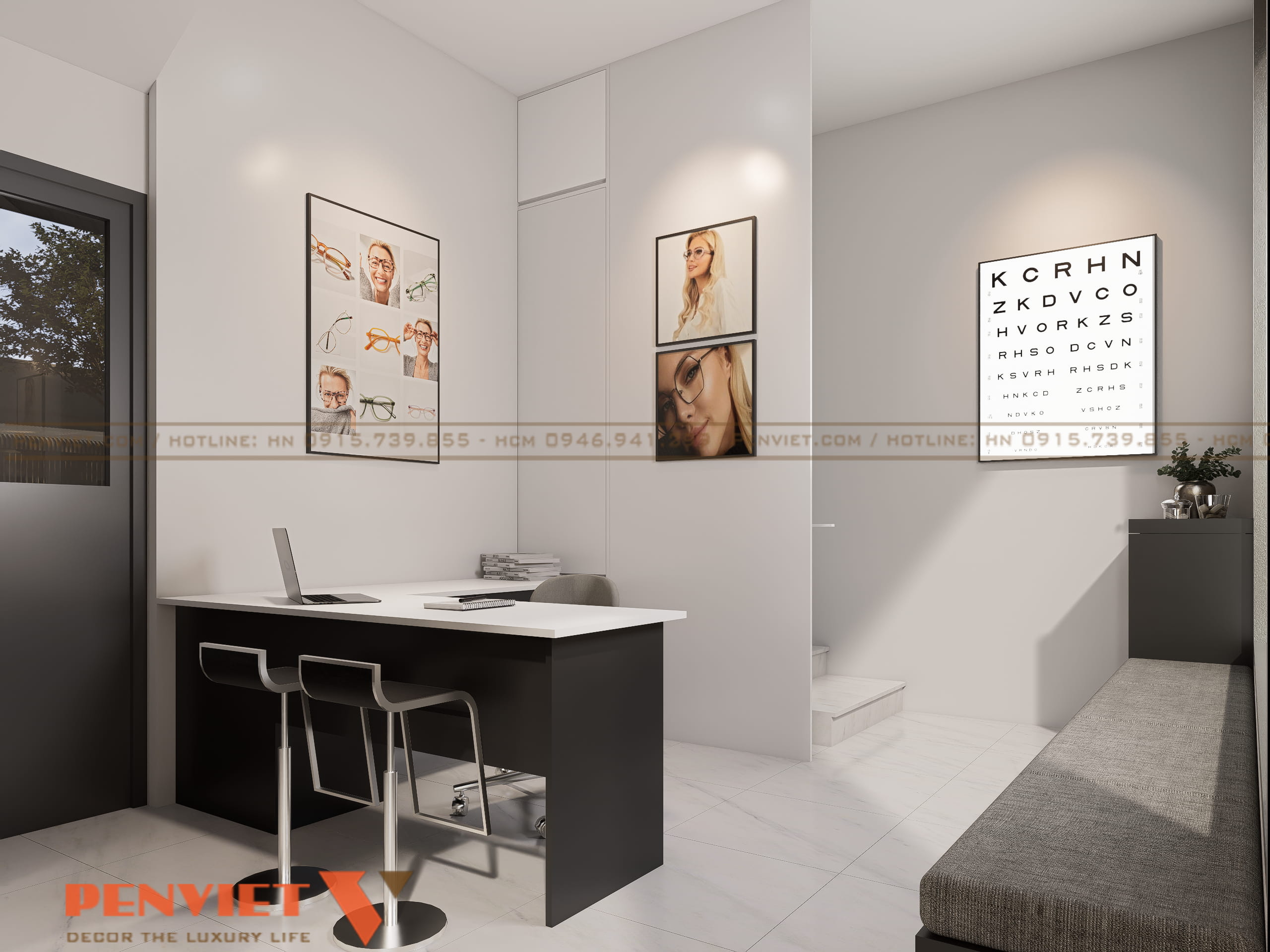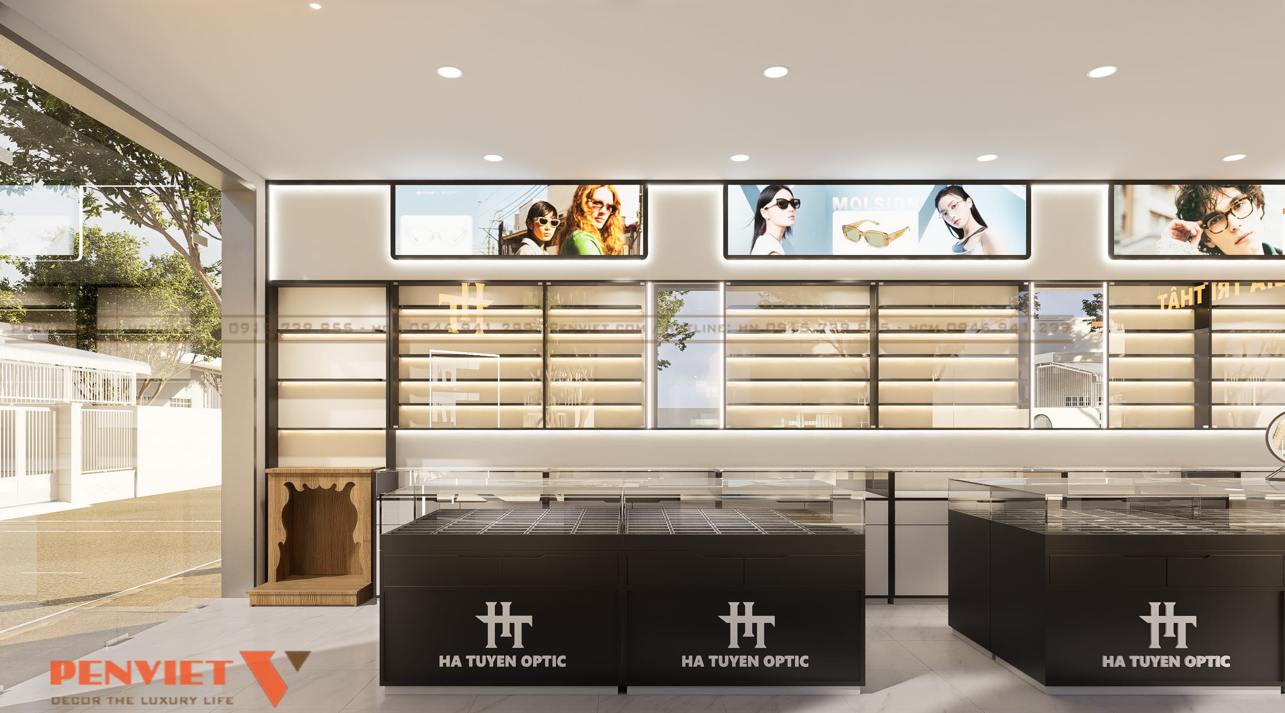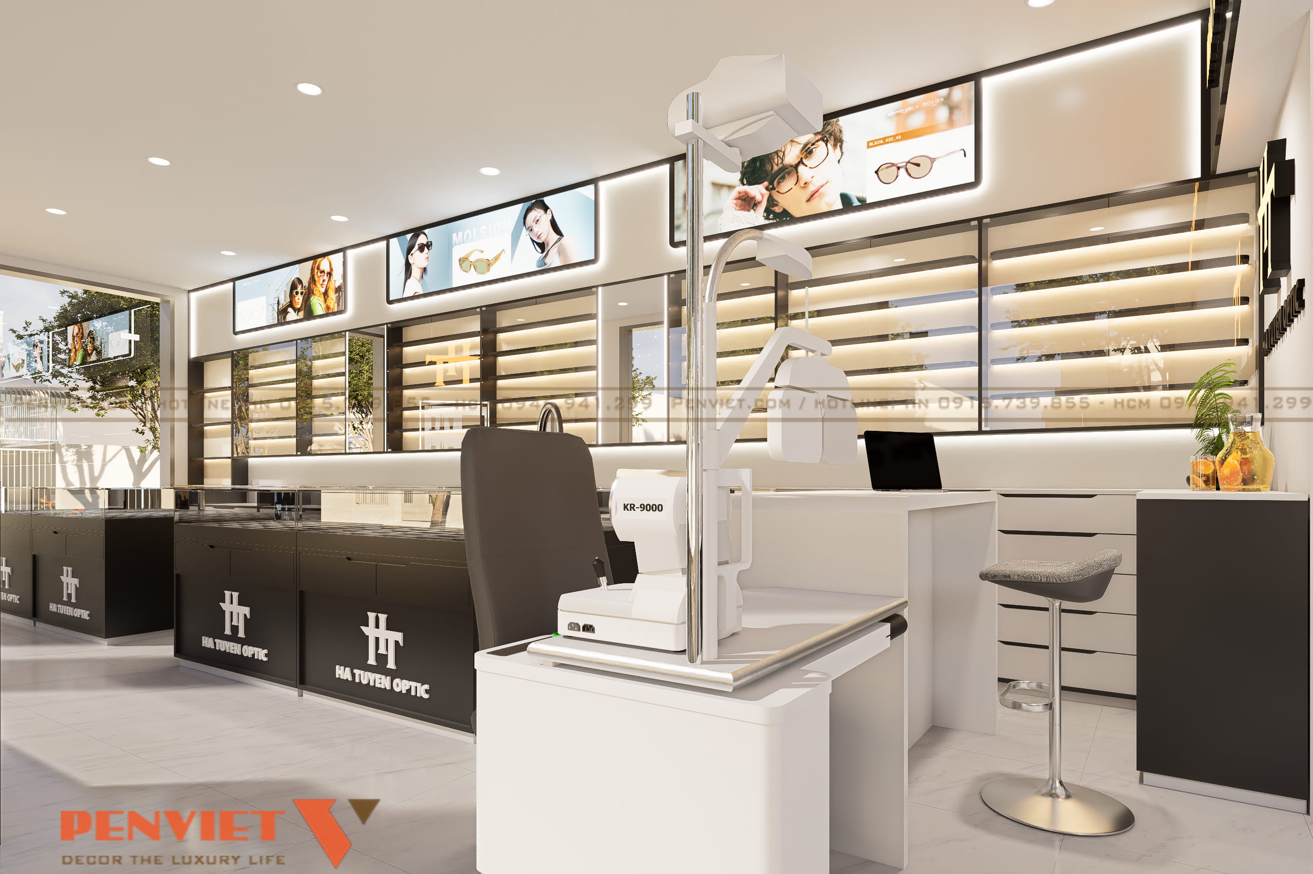 Khu trưng bày gắn tường sử dụng hệ tủ kính kết hợp đèn led, làm nổi bật sản phẩm. Quầy tư vấn và đo mắt bố trí cuối nhà, đảm bảo riêng tư và tập trung. Khu chờ được đặt cạnh cửa sổ, tận dụng ánh sáng tự nhiên và tạo cảm giác thoải mái. Mỗi khu vực đều rõ vai trò, hỗ trợ quy trình bán hàng mạch lạc.