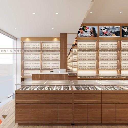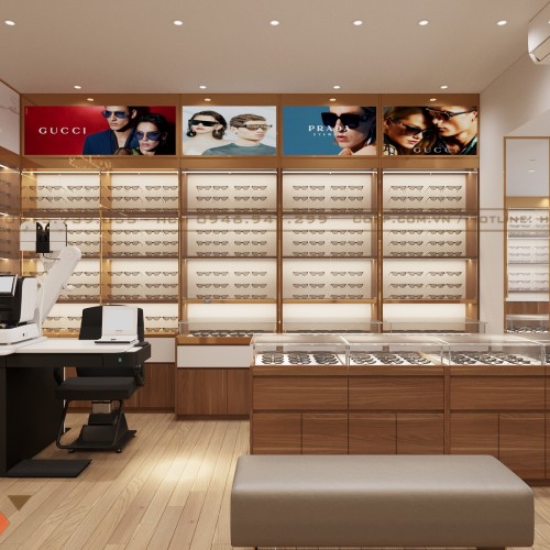 Ngay từ cái nhìn đầu tiên, không gian shop kính mắt mang đến cảm giác hiện đại và rất chuyên nghiệp. Tổng thể bố cục được tổ chức theo trục dọc với lối đi chính ở giữa, hai bên là hệ tủ trưng bày kính chạy dài theo tường, tạo thành một không gian đối xứng cân đối. Điểm nhấn chính nằm ở khu vực trung tâm với bàn tư vấn và quầy trưng bày độc lập, được bố trí thông thoáng, dễ dàng tiếp cận từ nhiều hướng.