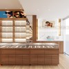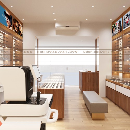 Màu sắc chủ đạo là nâu gỗ tự nhiên, kết hợp trắng sáng ở khu vực tường, mặt bàn, tạo cảm giác hiện đại, sạch sẽ và tin cậy. Đây là gam màu rất phù hợp với ngành kính mắt, lĩnh vực yêu cầu sự chuyên nghiệp, chính xác và thân thiện.
