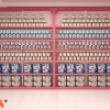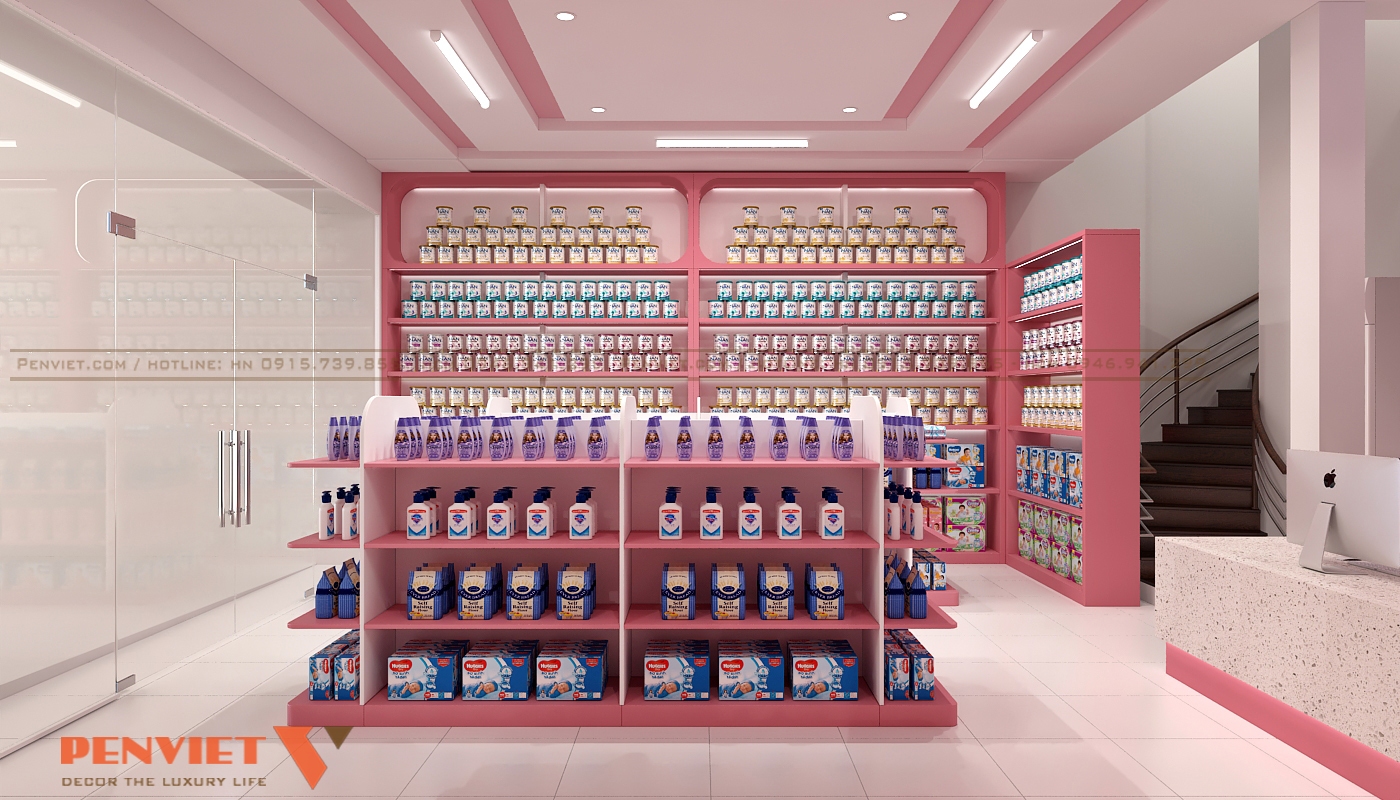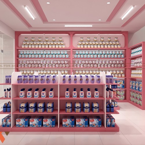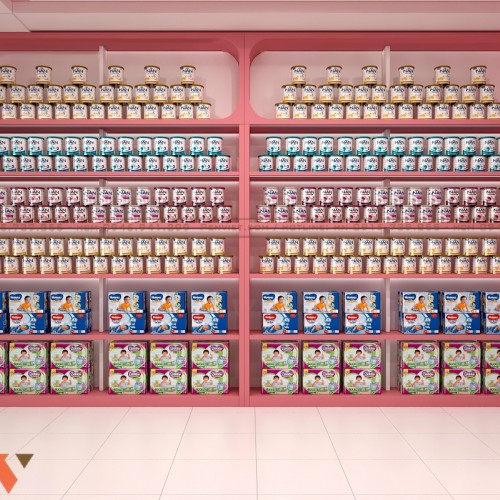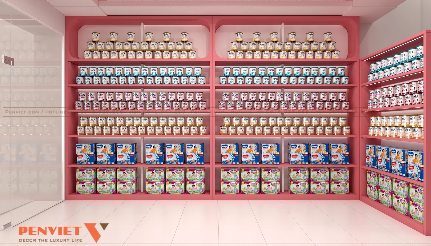 Hệ kệ áp tường cao kịch trần được bố trí khoa học. Sữa, bỉm và sản phẩm chăm sóc bé được sắp xếp theo từng nhóm rõ ràng. Màu kệ đồng bộ với tường giúp sản phẩm nổi bật hơn.