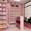 Khu vực phụ kiện cho mẹ được tách riêng. Máy hút sữa, bình sữa và đồ dùng chuyên dụng được trưng bày trên kệ trắng, nền hồng nhẹ. Sự tương phản giúp sản phẩm cao cấp hơn về mặt thị giác.