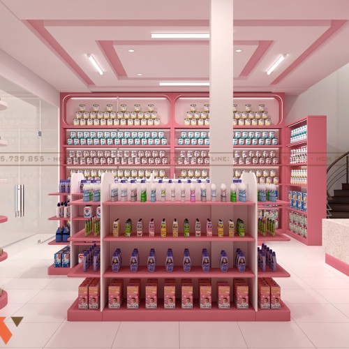 Các đảo kệ giữa nhà có chiều cao vừa phải. Khách dễ lấy hàng, nhân viên dễ bổ sung sản phẩm. Cách bố trí này phù hợp với cửa hàng có mật độ hàng hóa lớn nhưng vẫn cần sự gọn gàng.