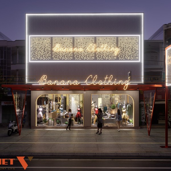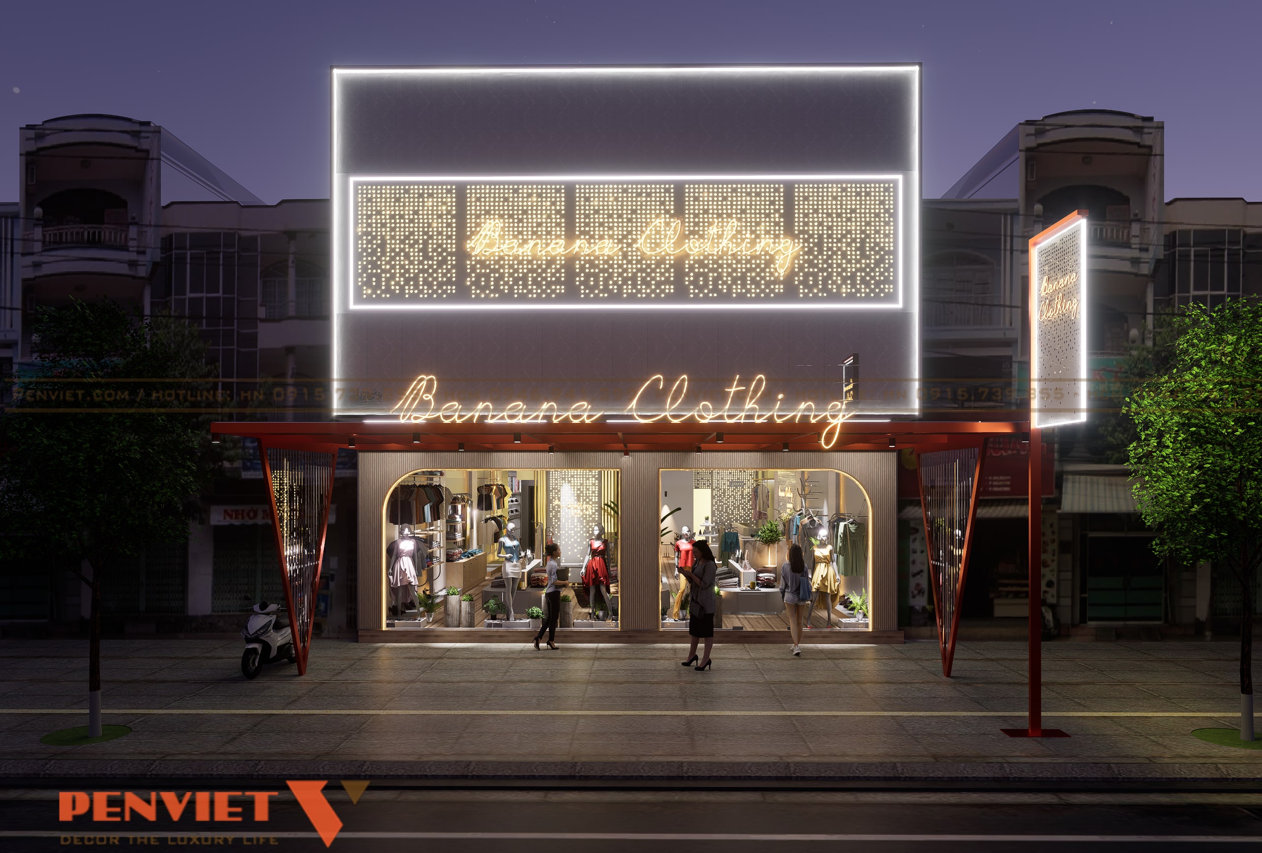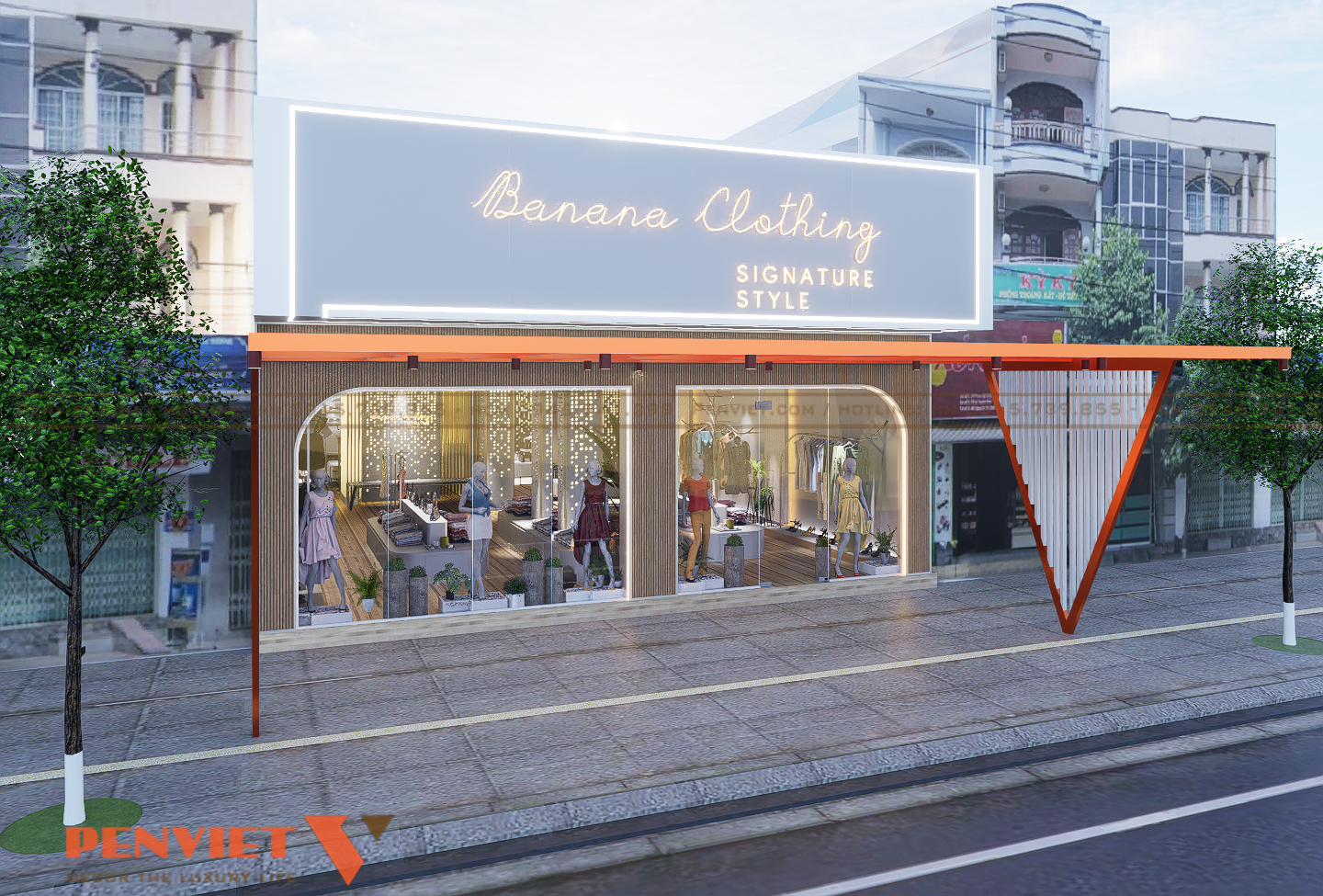 Mặt tiền cửa hàng Banana Clothing được thiết kế theo phong cách tối giản hiện đại, kết hợp giữa gam màu trung tính và ánh sáng nhấn mạnh để tạo sự sang trọng. Biển bảng quảng cáo sử dụng chất liệu mica cao cấp kết hợp đèn LED chiếu sáng, vừa nổi bật vào ban ngày vừa thu hút vào buổi tối. Logo thương hiệu được bố trí ở vị trí trung tâm, dễ dàng ghi nhớ trong mắt khách hàng.