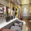 Phụ kiện và túi xách được bố trí ngay tại trung tâm cửa hàng, sử dụng bục trưng bày bo cong hiện đại. Bề mặt bục phủ sơn bóng mịn, kết hợp ánh sáng phản chiếu tạo sự sang trọng.
