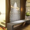 Hệ thống ánh sáng vàng tập trung làm nổi bật khu vực này, đồng thời tạo cảm giác ấm áp, thân thiện khi nhân viên tiếp xúc với khách hàng. Đây cũng là vị trí lý tưởng để trưng bày thêm một số sản phẩm nhỏ như khăn, phụ kiện hoặc thiệp cảm ơn, giúp tăng doanh thu và trải nghiệm dịch vụ.