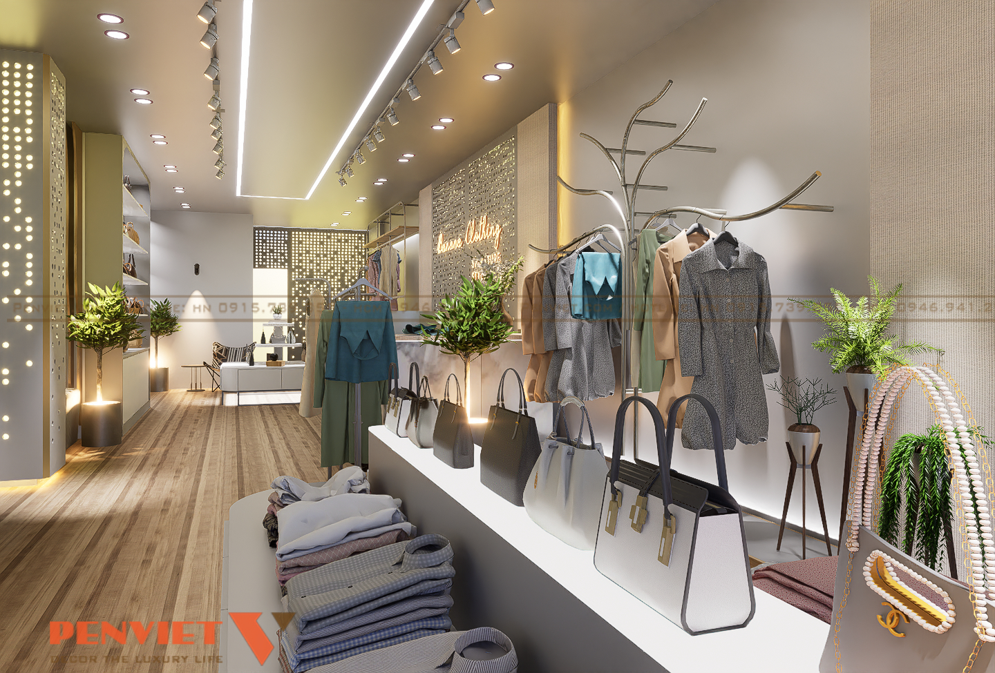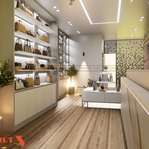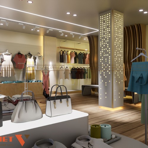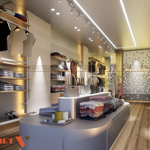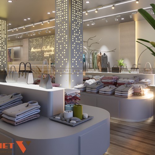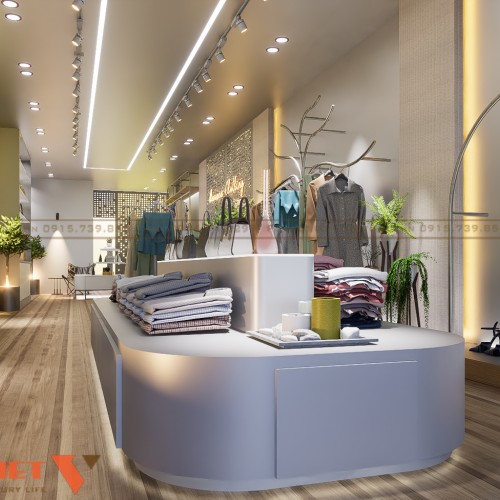 Vật liệu chủ đạo là gỗ công nghiệp chống ẩm, kim loại sơn tĩnh điện và kính cường lực. Các chi tiết bo cong mềm mại vừa mang tính thẩm mỹ cao, vừa đảm bảo an toàn cho khách hàng khi di chuyển. Màu sắc tổng thể trung tính, dễ dàng làm nền cho sự nổi bật của sản phẩm thời trang.