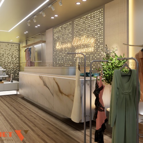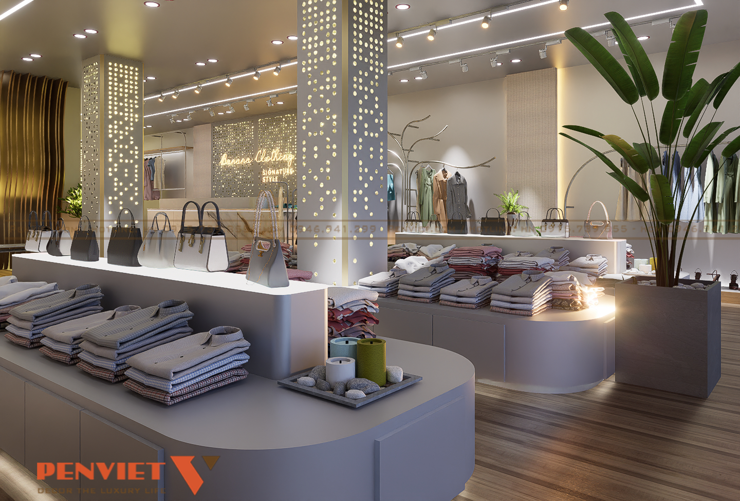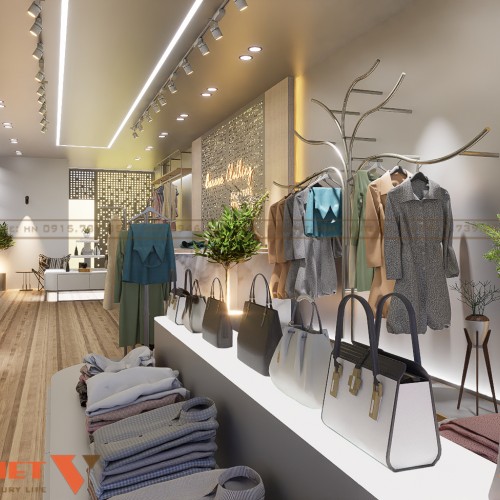 Không gian trưng bày quần áo là linh hồn của cửa hàng. Tại Banana Clothing, khu vực này được thiết kế với gam màu trắng be chủ đạo, kết hợp ánh sáng hiện đại để tôn vinh sản phẩm.