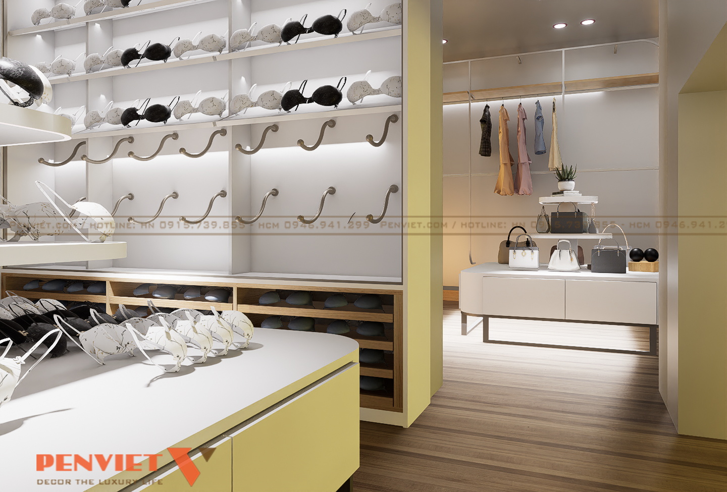 Các sản phẩm như túi xách, giày dép được sắp xếp khoa học, vừa tôn vinh giá trị từng món đồ vừa giúp khách hàng dễ dàng quan sát. Đây cũng là khu vực được tận dụng để trưng bày những sản phẩm mới hoặc hàng khuyến mãi, thu hút ánh nhìn ngay từ lối đi chính.