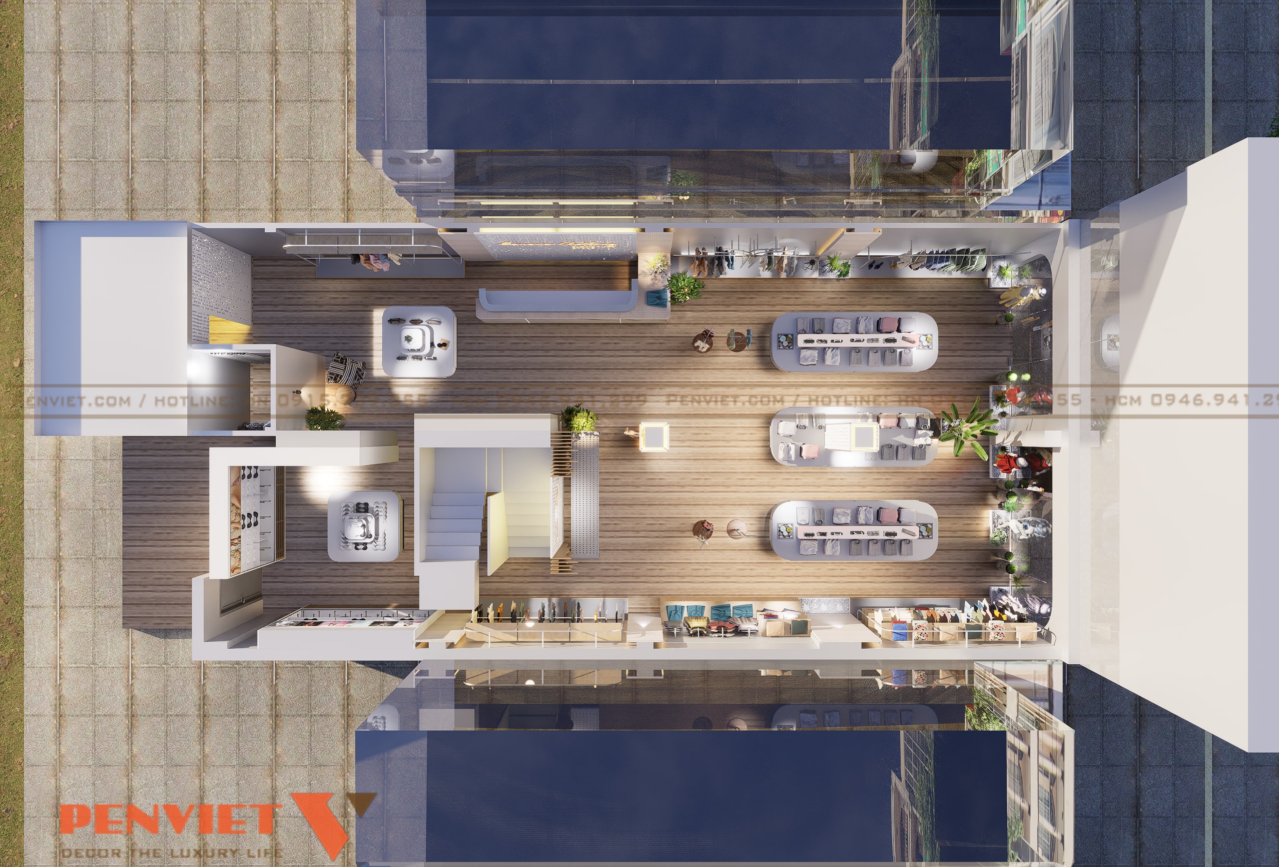 Với diện tích 140m2, cửa hàng được chia thành nhiều khu vực chức năng rõ ràng nhằm tối ưu hóa trải nghiệm mua sắm: