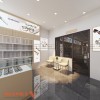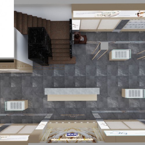 Quầy lễ tân không chỉ là nơi đón tiếp khách hàng mà còn tích hợp vai trò tư vấn sản phẩm. Phía sau quầy là bức tường có hoa văn hình học tinh tế, kèm theo logo của cửa tiệm được chiếu sáng bởi đèn LED nổi bật. Tất cả các yếu tố này tạo nên một hình ảnh tổng thể chuyên nghiệp và đáng tin cậy.