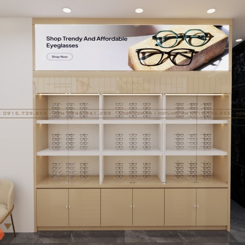 Mỗi kệ trưng bày được trang bị hệ thống đèn LED chiếu sáng bên trong làm nổi bật các mẫu kính. Phần bảng quảng cáo bên trên các kệ có tranh phát sáng với hình ảnh sản phẩm và các thông điệp như “Shop Trendy Eyeglasses” hay “Premium Eyeglasses - Upto 25% Off”. Đây là cách giúp khách hàng dễ dàng tiếp cận thông tin về các ưu đãi sản phẩm.