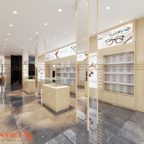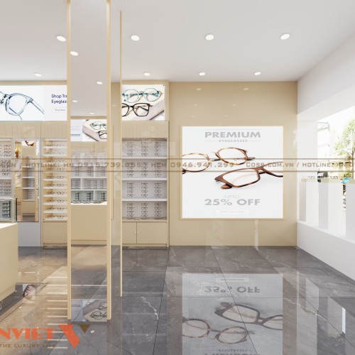 Không gian trưng bày là tâm điểm của cửa tiệm, được thiết kế thông thoáng và khoa học. Các kệ kính được chế tác từ gỗ MDF sơn phủ PU chống xước, kết hợp với kính cường lực chắc chắn. Cách bố trí kệ dọc sát bề mặt tường giúp khách hàng dễ dàng ngắm nhìn toàn bộ sản phẩm, từ kính cận, kính mát cho đến các dòng kính cao cấp.
