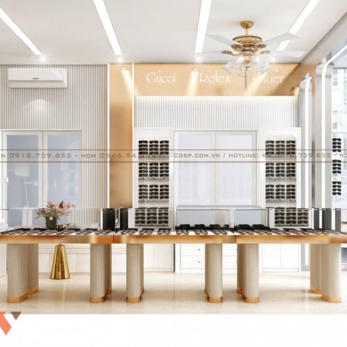 Ngay khi bước vào cửa hàng, bạn sẽ nhìn thấy hệ thống trưng bày kính được phân chia thành các khu vực riêng biệt nhưng ngăn nắp, gọn gàng. Kệ trưng bày kính chính làm từ kính cường lực trong suốt, khung viền inox mạ vàng và gỗ MDF cốt xanh vừa bền bỉ vừa thẩm mỹ.