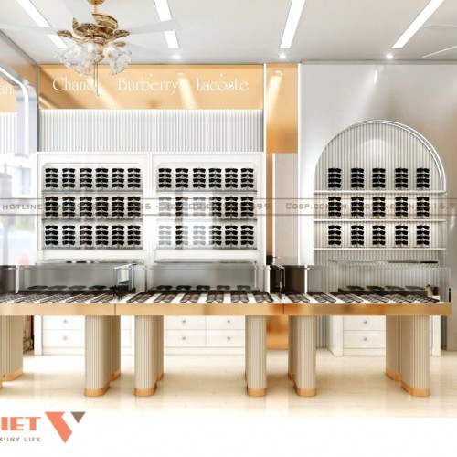 Ngoài ra còn có hệ tủ sát tường trưng bày các thương hiệu mắt kính như Chanel, Gucci, hoặc Fred… Các mẫu tủ sát tường nhiều kiểu dáng như mái vòm, hình chữ nhật nhấn mạnh sự sang trọng và đẳng cấp.