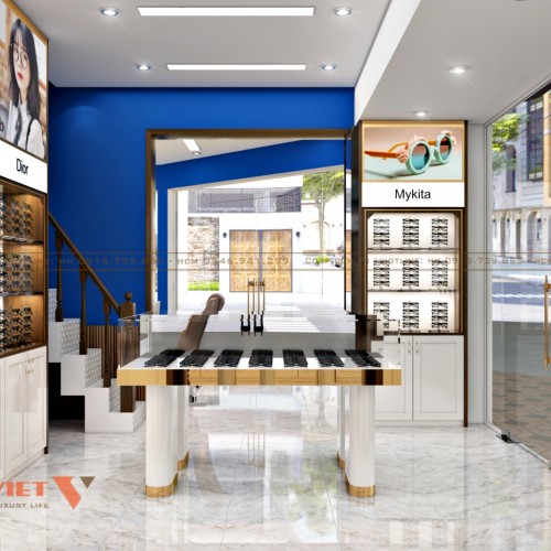 Bên trong, khu vực trưng bày mắt kính là điểm nhấn chính thiết kế với phong cách hiện đại, tinh tế. Tại đây có bộ sưu tập đa dạng các gọng kính và kính mắt đến từ thương hiệu nổi tiếng như Rayban, Dior,... Mỗi thương hiệu được trưng bày tại khu riêng biệt với tấm nền có đèn chiếu sáng hiển thị hình ảnh quảng bá và tên để người mua dễ nhận biết.