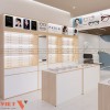 Các hộc trưng bày có hệ đèn LED âm chạy viền, giúp sản phẩm nổi bật, đồng thời tạo hiệu ứng sang trọng cho không gian. Bên trên tủ là dãy hình ảnh quảng cáo thương hiệu và người mẫu đeo kính, tăng tính nhận diện và khơi gợi nhu cầu của khách hàng.