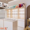 Hai bên tường của thiết kế tiệm kính mắt An An được bố trí hệ tủ trưng bày kính cao kịch trần với khung gỗ MDF cốt xanh phủ melamine sáng màu, kết hợp cánh tủ dưới màu trắng. Thiết kế này vừa mang tính thẩm mỹ vừa có độ bền cao, dễ lau chùi.