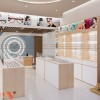 Giữa không gian có hai quầy kính dạng đảo với mặt kính trong suốt, khung gỗ sáng màu đồng bộ với hệ tủ tường. Thiết kế này giúp khách dễ dàng quan sát sản phẩm ở nhiều góc độ, đồng thời tạo lối đi hai bên rộng rãi, thuận tiện cho việc di chuyển.