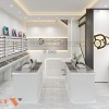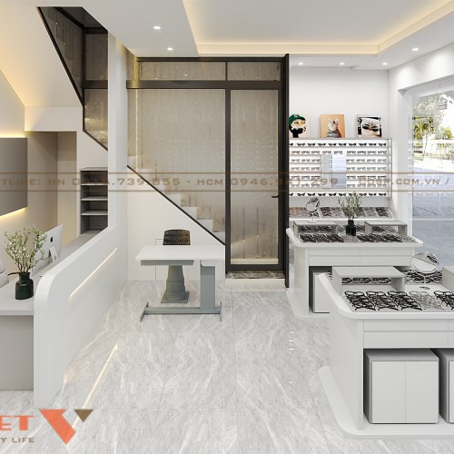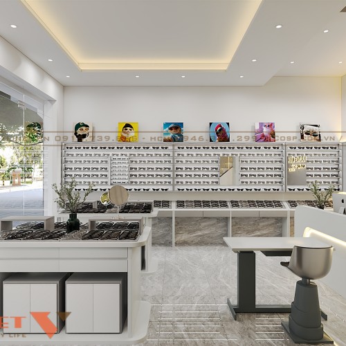 Bước vào bên trong tiệm kính, khách hàng sẽ cảm nhận được một không gian trưng bày rộng rãi, ngăn nắp. Thiết kế theo phong cách hiện đại, tối giản nhưng không hề đơn điệu. Màu sắc chủ đạo vẫn là trắng, kết hợp cùng sắc xám đá marble ở chân tủ và sàn, tạo nên tổng thể thanh lịch và đồng nhất.