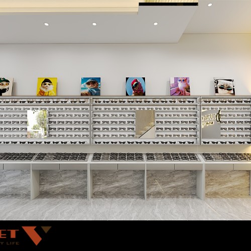 Một trong những điểm thú vị trong thiết kế tiệm kính mắt Dương Kính chính là việc sử dụng các yếu tố trang trí mang tính sáng tạo và cá tính. Trên tường là những bức ảnh động vật đeo kính đầy hài hước, trẻ trung tạo không khí thoải mái và dễ gần cho người ghé thăm. Cây xanh nhỏ đặt trên quầy và các đảo trưng bày cũng góp phần mang lại sự cân bằng tự nhiên cho không gian.
